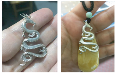 将客户提供的设计方案草图利用3D建模立体化,再用3D打印机打印出蜡模,用失蜡法铸造工艺铸成银制品,最后做成蜜蜡首饰。